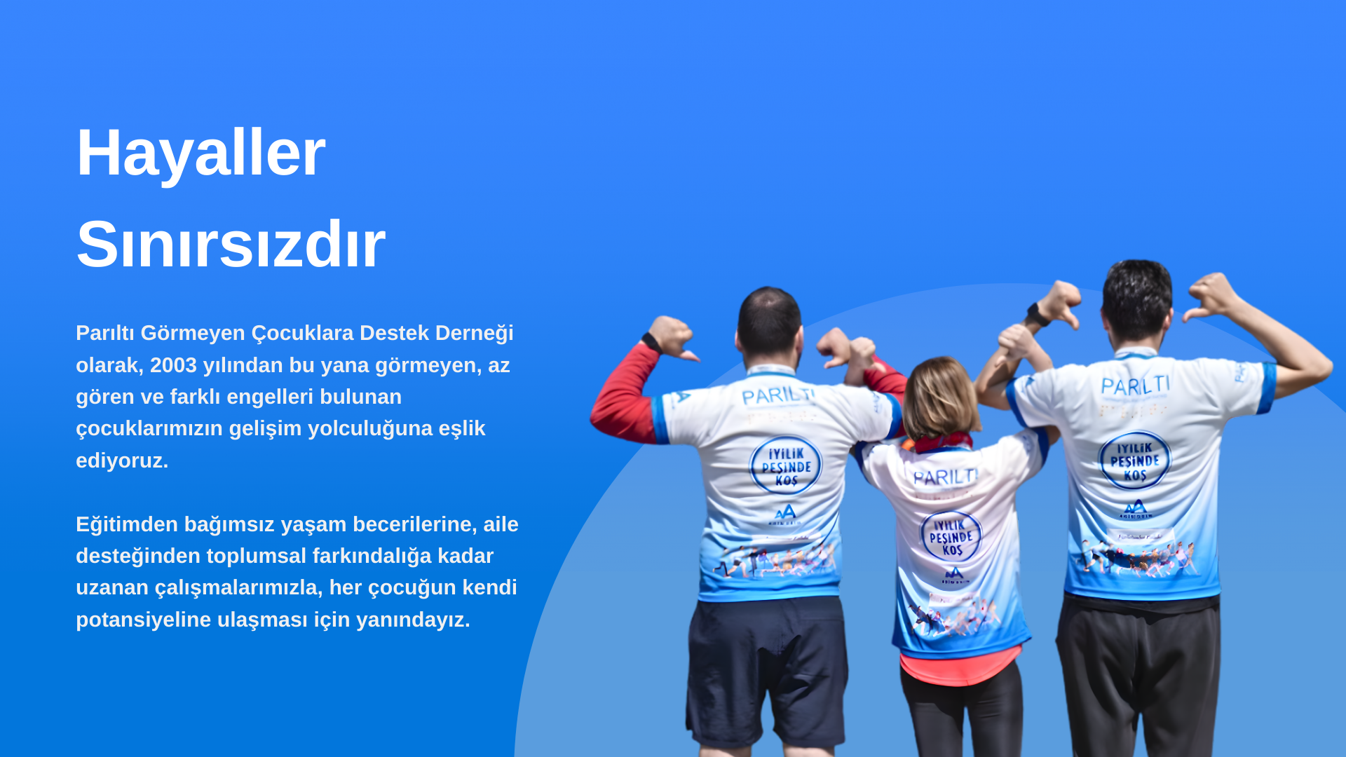 Parıltı Görmeyen Çocuklara Destek Derneği, çocuklarımızın sadece görme engeliyle değil, tüm yetenekleriyle tanınması için çalışıyor. Onların eğitim, sanat ve spor alanındaki başarılarına tanıklık edin. Bu mücadeleye siz de katılın ve hayatlarına parıltı katın!